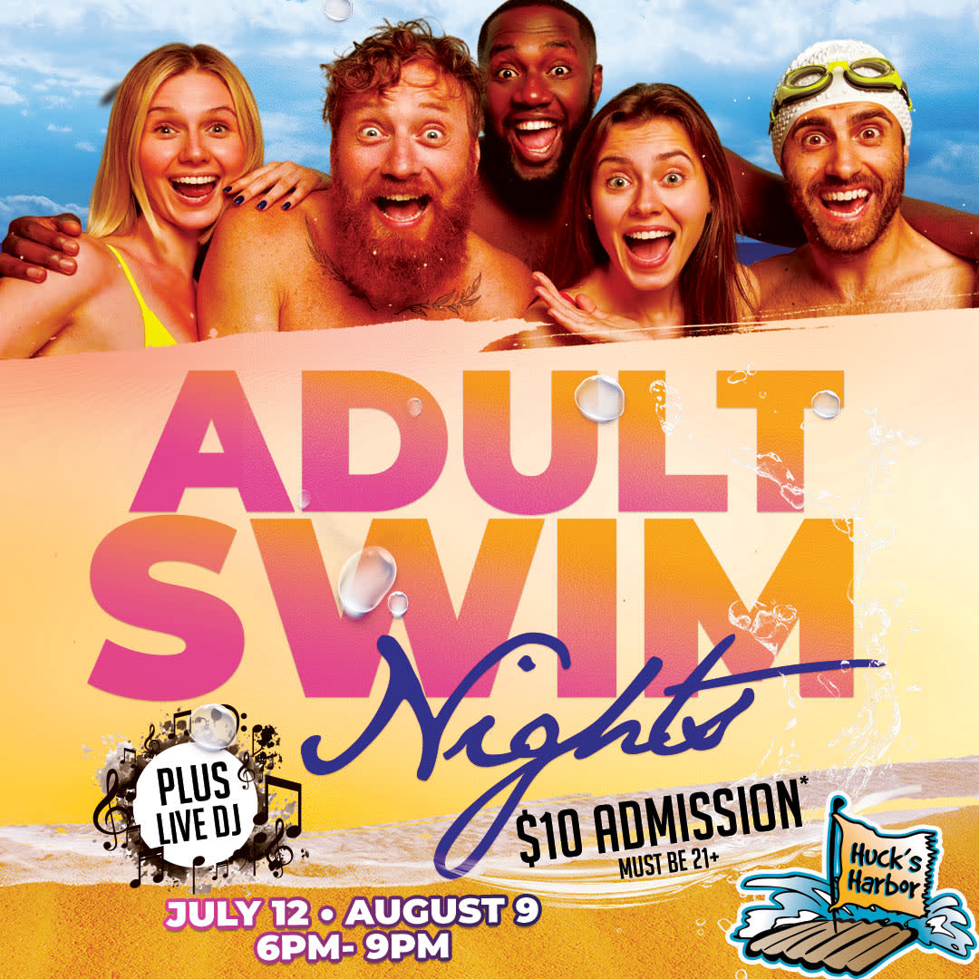 Just for the big kids: Huck’s Harbor Outdoor Water Park is open for adults only from 6 to 9 PM on July 12 & August 9, with a live DJ, waterslides open from 6 to 7:30 PM and the Tiki Bar open for food and drink service.