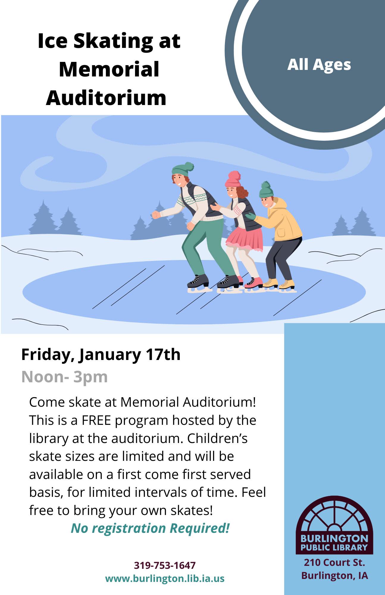 No ice? No problem! Hit the ice at the indoor ice-skating rink at Memorial Auditorium FREE today from noon to 3 PM, courtesy of Burlington Public Library.