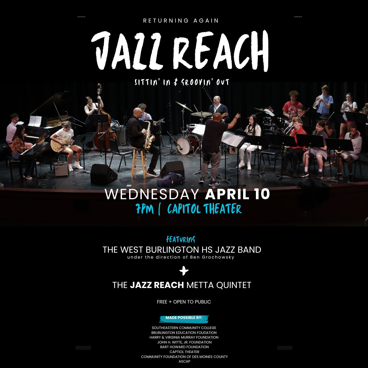 JazzReach concludes with a concert featuring the West Burlington High School Jazz Band at 7 PM on Wednesday April 10. The concert is free and open to the public.