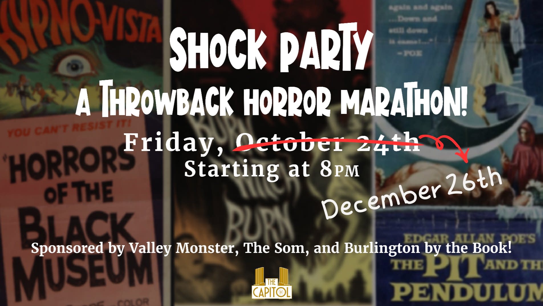 Back in 1970, the Capitol Theater hosted the original all-night Shock Party, a horror marathon that thrilled and chilled Burlington audiences. Now, 55 years later, we’re bringing it back to the big screen in the heart of downtown!