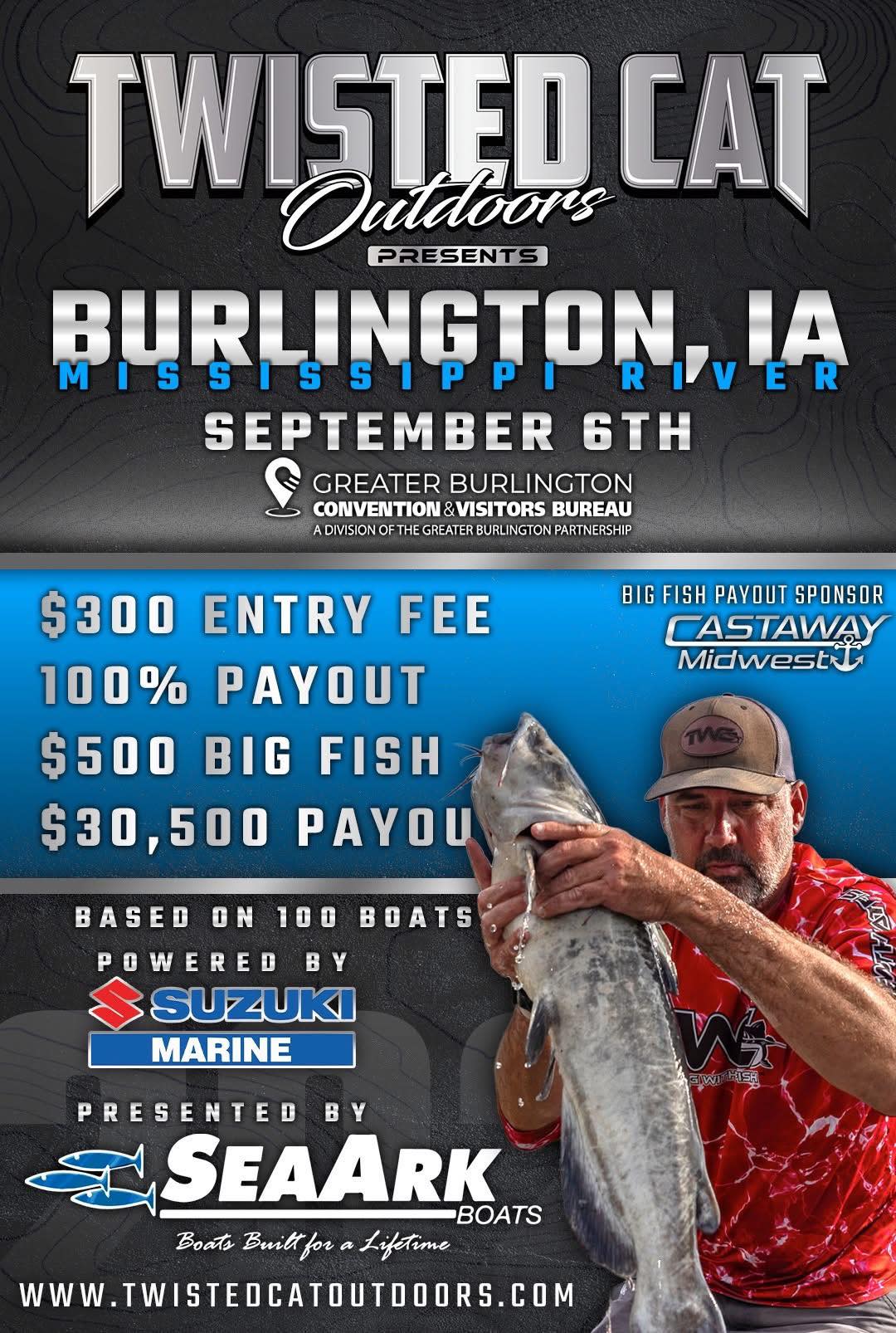 Tournament Details: Location: Burlington, IA (Pool 19, Mississippi River) Date: Saturday, September 6, 2025 Time: Whether you’re here to compete, spectate, or enjoy the electric atmosphere, this tournament promises to be one for the books. Stay tuned for updates on registration, payouts, and additional event details. Don’t miss your chance to be part of the excitement and make your mark on the 2025 Twisted Cat Outdoors No Excuse Tour!
